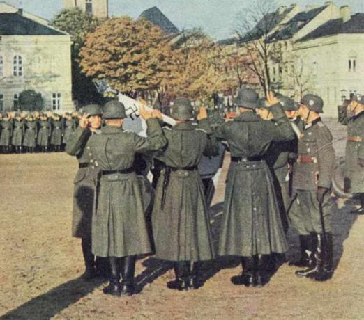 Prisega Hrvata iz SS Handžar divizije podizanjem tri prsta. Muslimani, pripadnici iste vojne formacije prisežu desnom rukom preko prsa