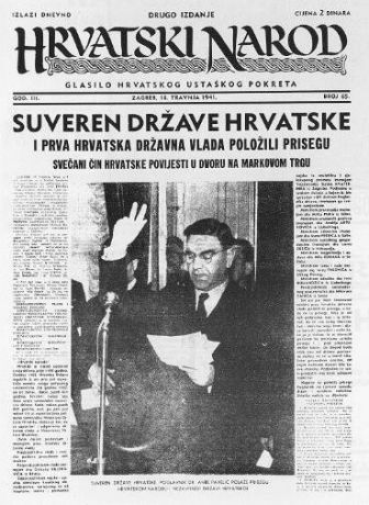 Naslovna stranica glasila hrvatskog ustaškog pokreta "Hrvatski narod" koji izvještava sa prisege prve državne Vlade NDH. Na slici: Poglavnik Ante Pavelić dok čita tekst prisege, naravno sa podignuta tri prsta...