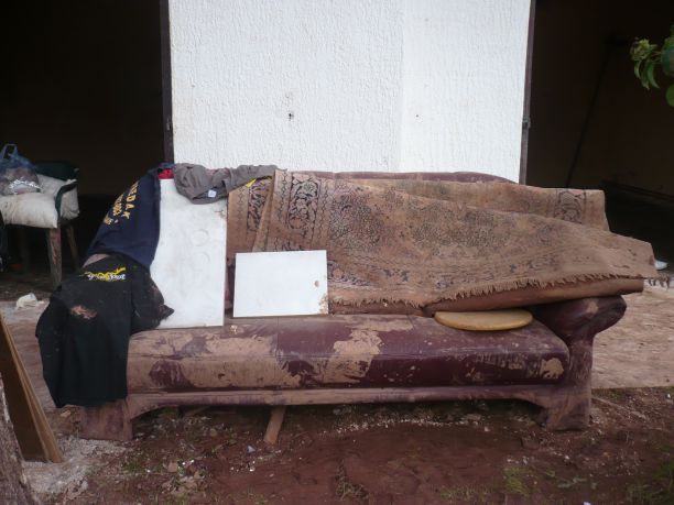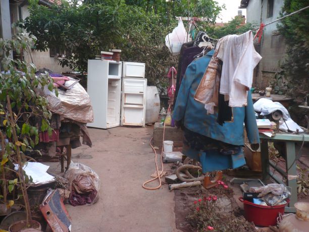 „Tri dana smo bili pod vodom, nismo mogli da siđemo sa sprata, muž i ja, svekar i svekrva Kćerka je u Beogradu na fakultetu, a sin je punio džakove i posle više nije mogao da se vrati. Komšije i vatrogasci su nam donosili vodu i kad je opao nivo reke, sišli smo. Šteta je totalna. Izbacili smo sve iz obe kuće. Ovo je velika finansijska šteta. Samo ja primam platu, radim u bolnici, svekar i svekrva primaju penziju, muž ima privatnu firmu, njemu su sve zalihe potopljene, Jovana je student, Ivan ne radi, tako... Tu praktično nema ni od kredita ništa. Kuće su obe po 80 kvadrata, spolja je voda bila 2,20, a unutra 1, 70, merili smo“, priča Milanov Mladenka u kratkom predahu čišćenja kuće. Sin i njegov drugar iznose ostatke stvari napolje.... Sve je u bašti. Knjige pokušavaju da osuše, garderoba visi na ofingerima, zakačena za štrikove, sva u blatu.