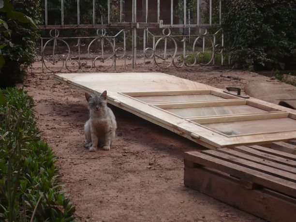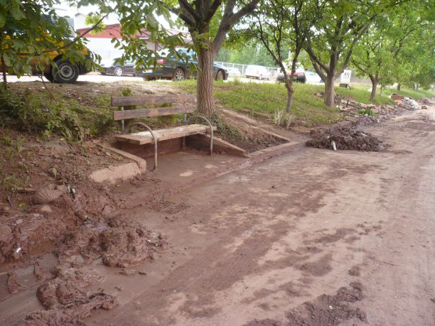Hodamo trotoarom. Klupe sa strana su prekrivene sasušenom zemljom. Ima je i na listovima vinove loze, cveća.... Poneki grm ruža, nedirnut, cveta u baštama. Samo se na listovima vide tragovi blata, znak da su bile pod vodom. Ulepšavaju potpuno razoren krajolik.